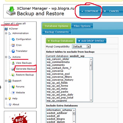 Теперь сделаем резервную копию сайта, для этого, раскройте всё меню плагина и пройдите в Action -> Generate Backup. По умолчанию всё уже настроено, всё что Вам нужно сделать, так это нажать на Continue, в верху экрана. Так же есть возможность исключить некоторые таблицы из backup, если есть такая необходимость, просто выделив их в таблице.