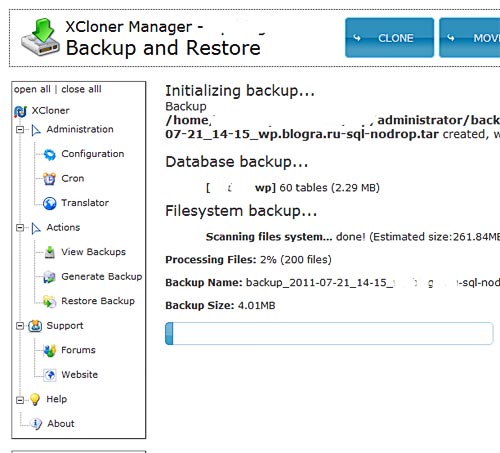 После того как Вы загрузили копию в директорию, Вам нужно взять два файла XCloner.php и TAR.php, которые хранятся в заархивированно сборке и загрузить их в папку, где уже лежит backup WordPress. Далее в строке браузера Вам нужно набрать адрес сайта и название файла (http://wpandyou.ru/XCloner.php) и начать установку копии WordPress на домен.