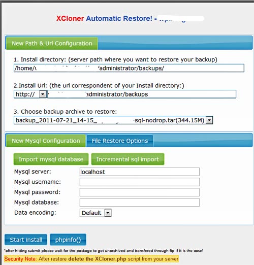 После того, как установка завершиться удалите архив бэкапа и файлы XCloner.php и TAR.php. После этого зайдите по адресу на сайт и увидите , что сайт полностью скопирован и работает. Данный метод очень удобен, если Вы делаете большое количество сайтов, Вы можете настроить один движок, всеми необходимыми плагинами и сделать копию сайта, а в дальнейшем, как только делаете новый сайт, устанавливаете Ваш настроенный движок. Данный метод сэкономит Вам достаточно много времени и сил.